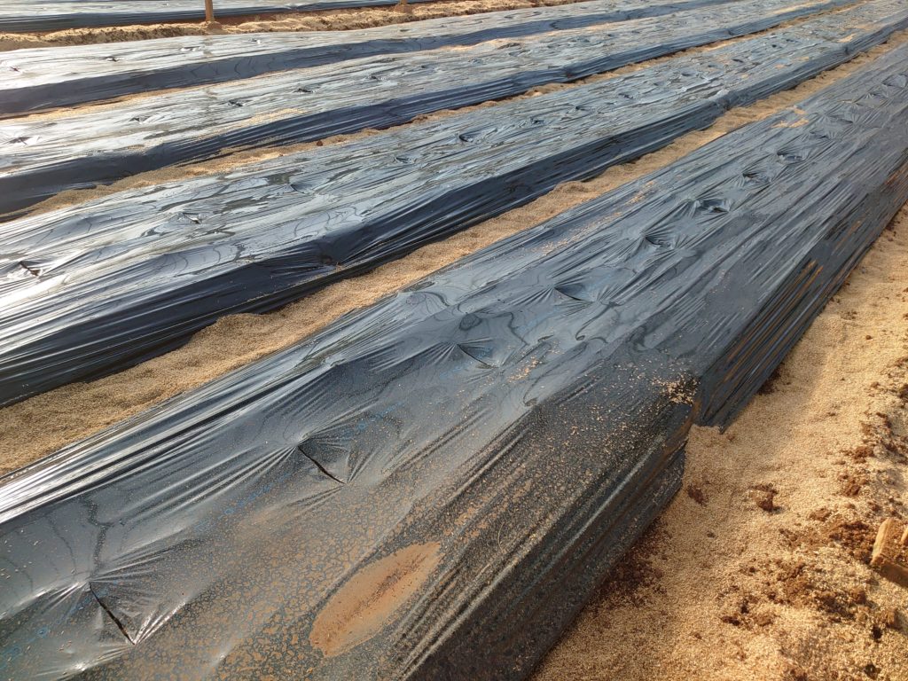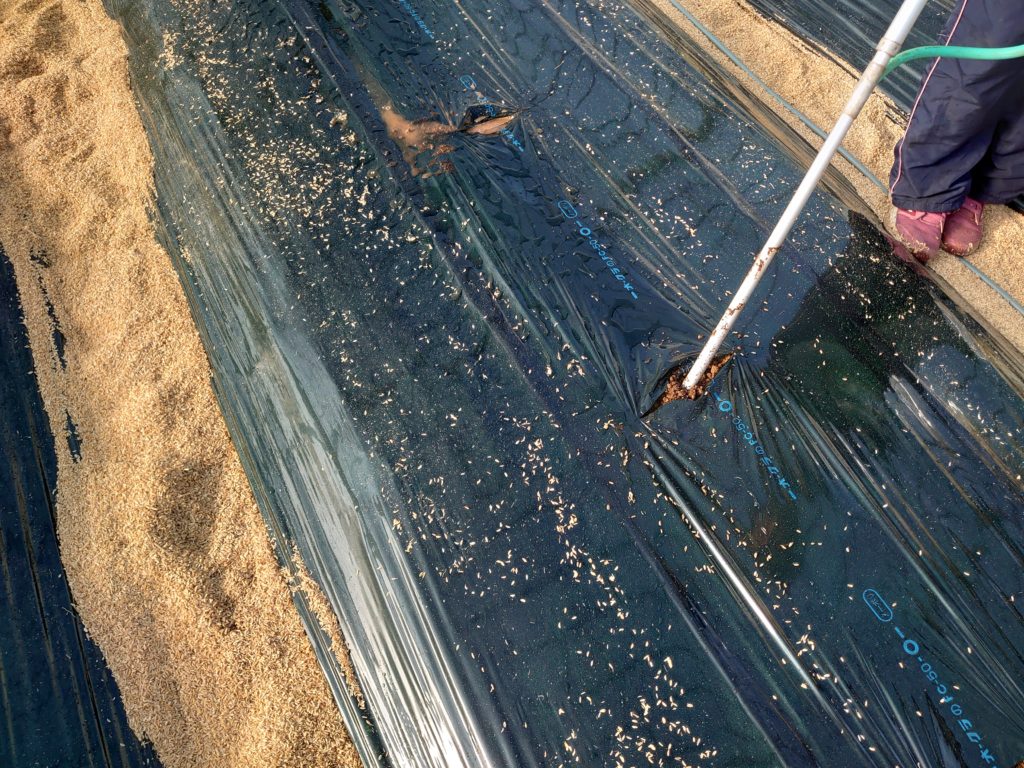 きゅうり定植の前にマルチに穴を開けます。季節によって間隔は変えており、夏は広く、冬は狭くしています。