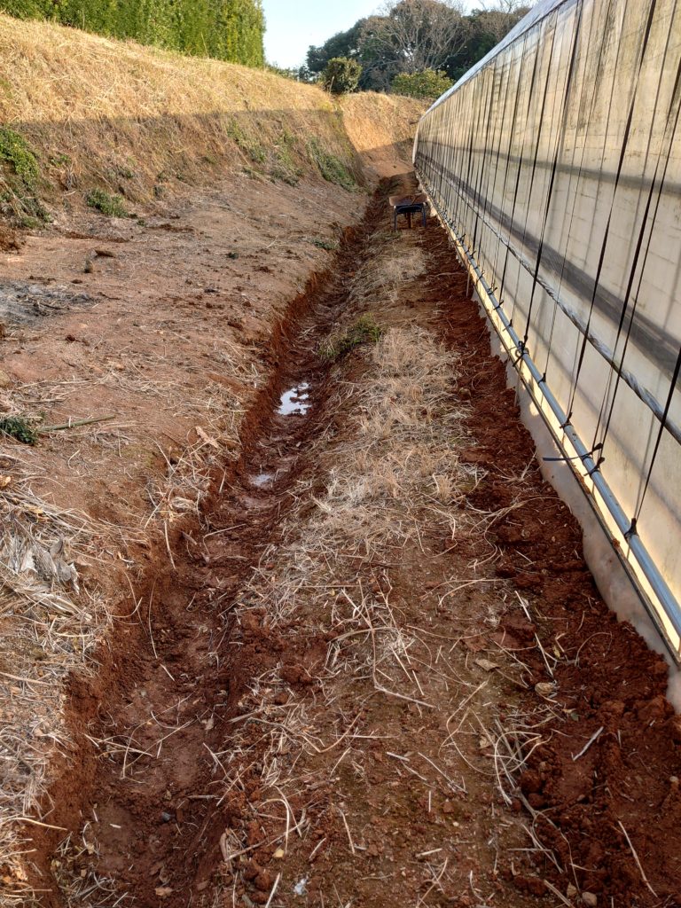 思ったより作業が早く終わったのでハウス横の溝をあげました。去年豪雨でハウス内が浸水しかけたので対策として溝をほりました。簡単と思いきや…