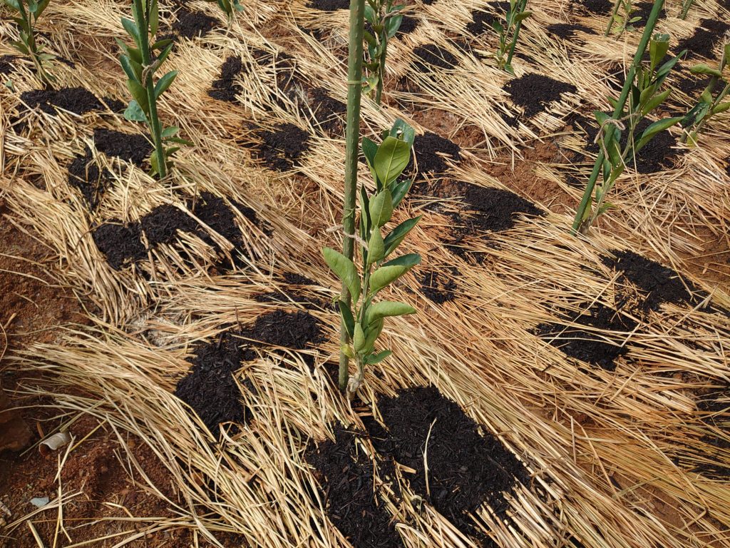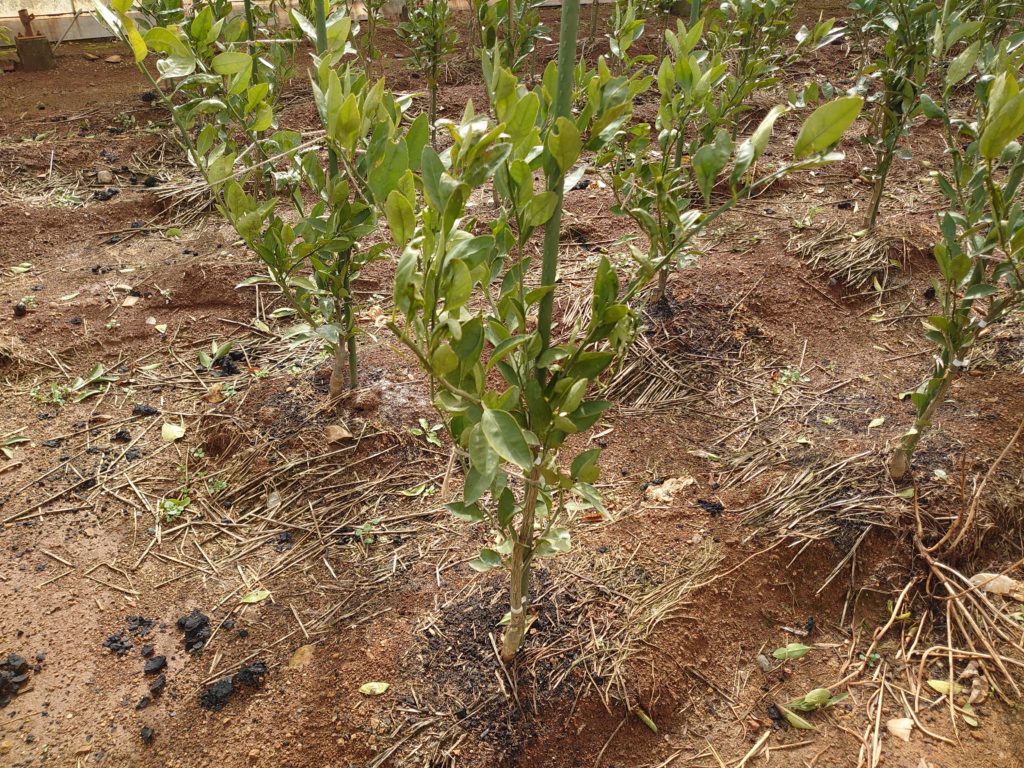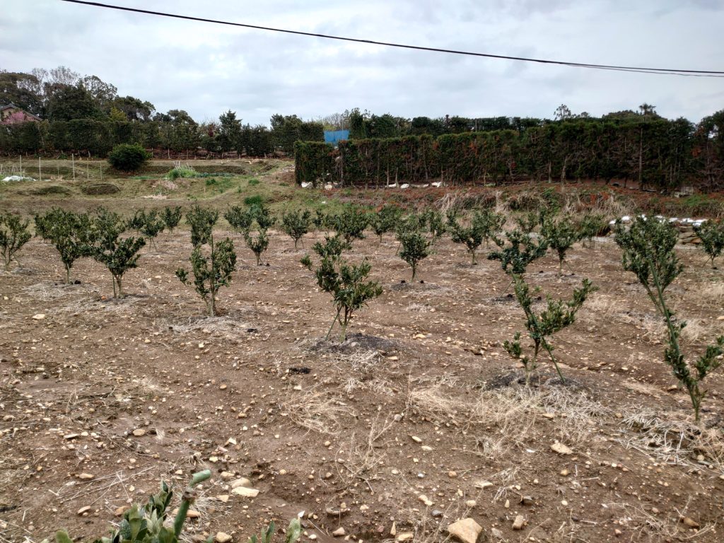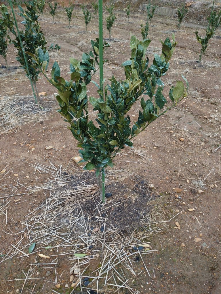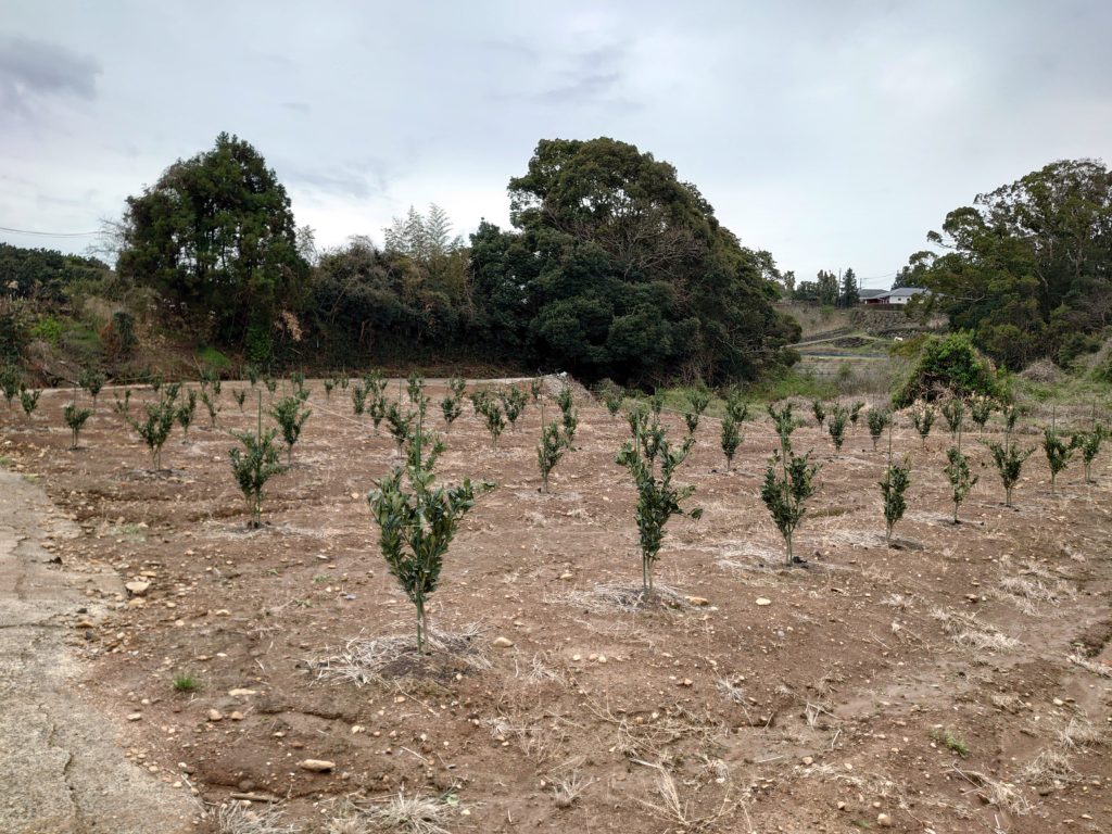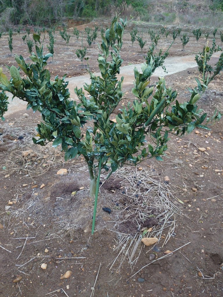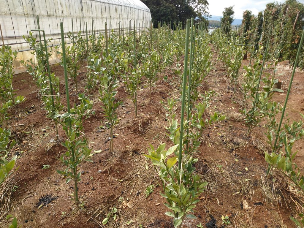 4年生の苗木です。この年から初めて実をならせていきます。そして5年目からはタイベックシートを張ります。まだまだおいしくなるのには年月がかかりますがこうしてみかんはできていきます。