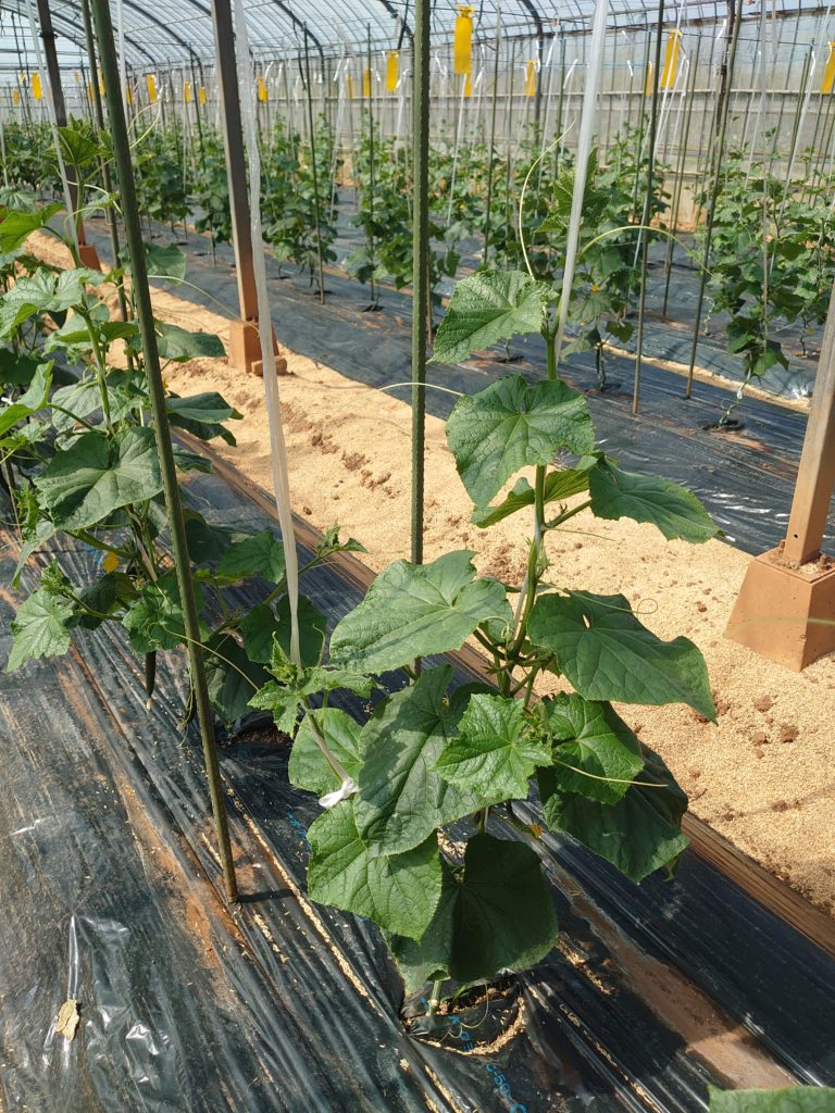 下から5,6枚程度は成長の妨げになるので葉も実も全てむしっています。黄色いぶら下げているのは害虫を捕獲する粘着質があるものです。コナジラミやアザミウマ、ハエなどきゅうりにとって大敵を捕獲してくれるのでお勧めですよ(^^)v