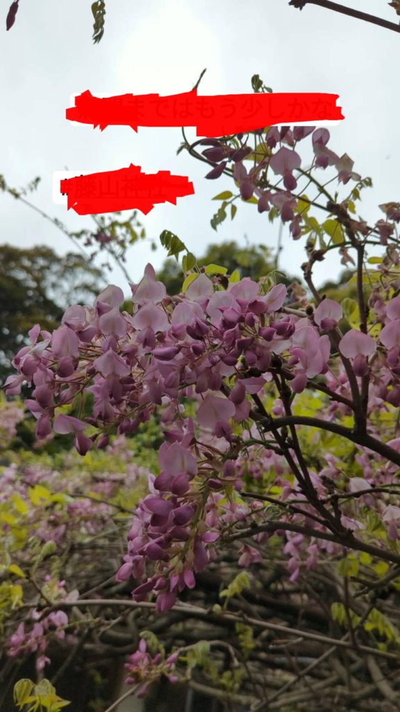 そんなことはさておき、この時期見ごろを迎えるのは『藤の花』、そうアニメ鬼滅の刃でもでてくる花です。市内には藤山神社という藤の花の名所があります。家族でちらっと行ってきました。