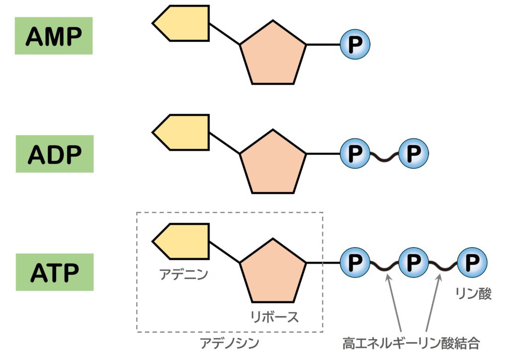 左側の緑で囲まれている文字の名称は上から『アデノシン一リン酸』、『アデノシン二リン酸』、『アデノシン三リン酸』と言います。Pがリン酸ですのでその数の違いがそのまま名称になっているので分かりやすいですね。