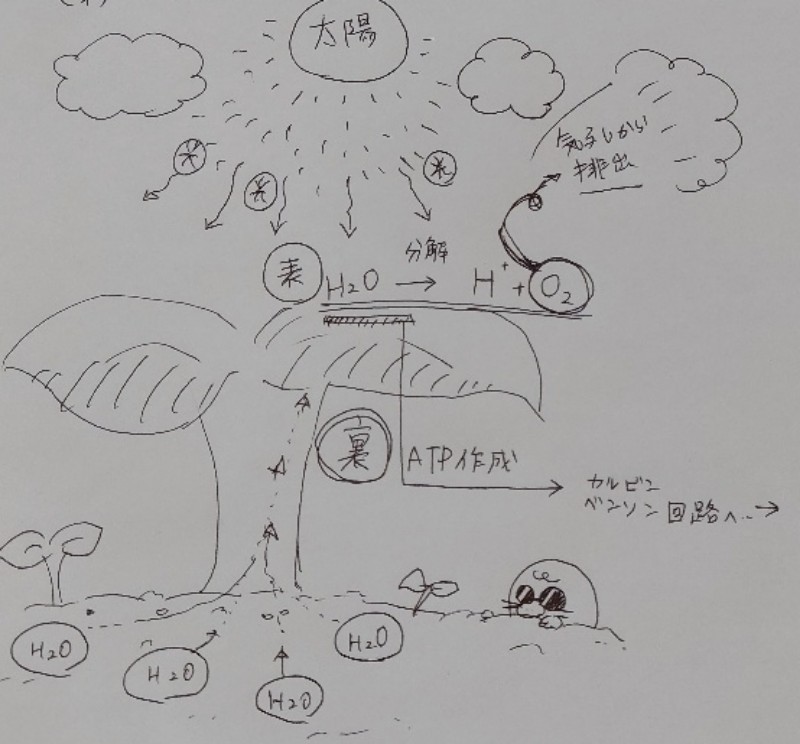 まず土の中にあるH₂Oを植物が吸い上げます。そこに太陽からの光エネルギーが加わることでH₂OがH(水素)とO₂(酸素)に分解します。O₂(酸素)はこの時点で早くも気孔から外に排出されます。