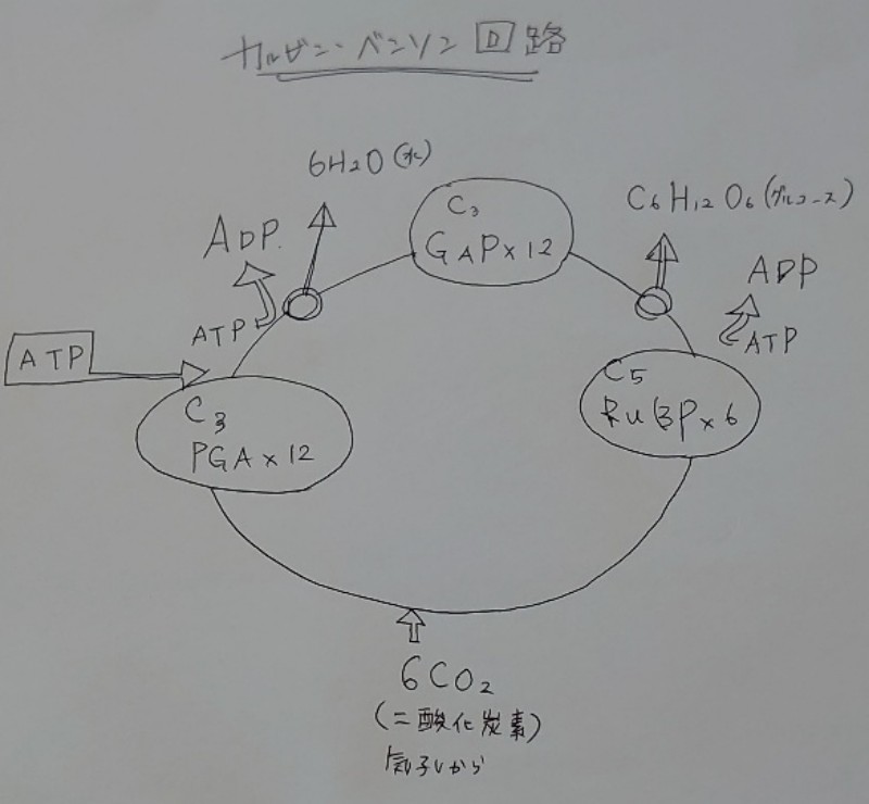 回路に入ったATPは早速ADPとなり回路を回すためのエネルギーを放出します。まぁ通行料みたいなもんです。同時にH₂O(水)が生成されます。その後『GAP』を合成しつつ回路を進みます。GAPを通過した後にC₆H₁₂O₆(グルコース)が生成されます。ここでまた体内にあるATPを使いエネルギーを放出してさらに回路を進めます。次に『RuBP』が合成されます。そして最後の最後にやっと気孔から取り込まれたCO₂が加わり『PGA』を合成する過程となり回路が回る仕組みとなっています。