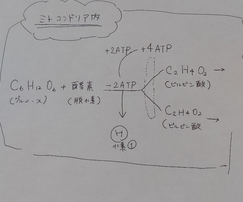 まずは、ミトコンドリアの中で糖の分解が行われます。ちなみにグルコースとは『ブドウ糖』のことです。