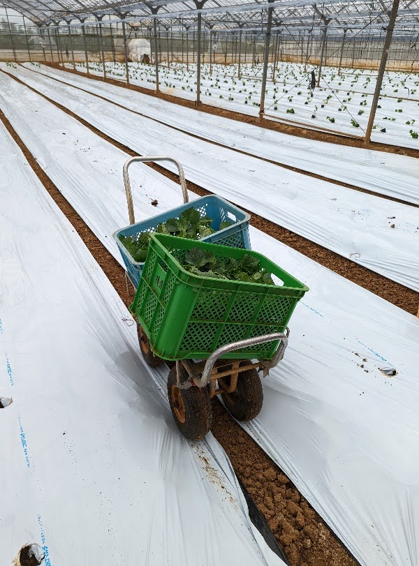 そしてきゅうりの定植に入ります。これがけっこうきついんです(笑)。本数が多いのもありますが、ずっとかがんで横移動を何時間もするので足はパンパンになります。幸いこの日は晴れていなかったので体力の消費は抑えられました(^^)v