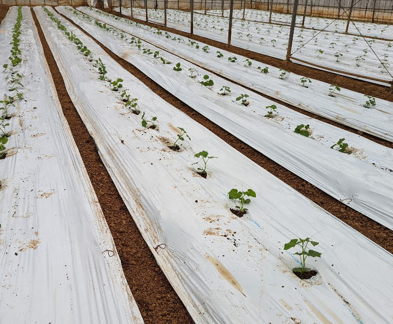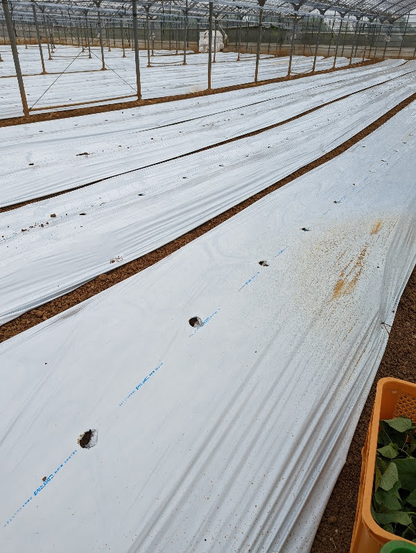 きゅうり定植前にマルチに穴を開けました。夏きゅうりということもあり株間は広めにとり管理しやすくしています。マルチを張るとハウスの広さがはっきりと分かるのでいつものことながら、『これから大変になるなぁ』と感じます。