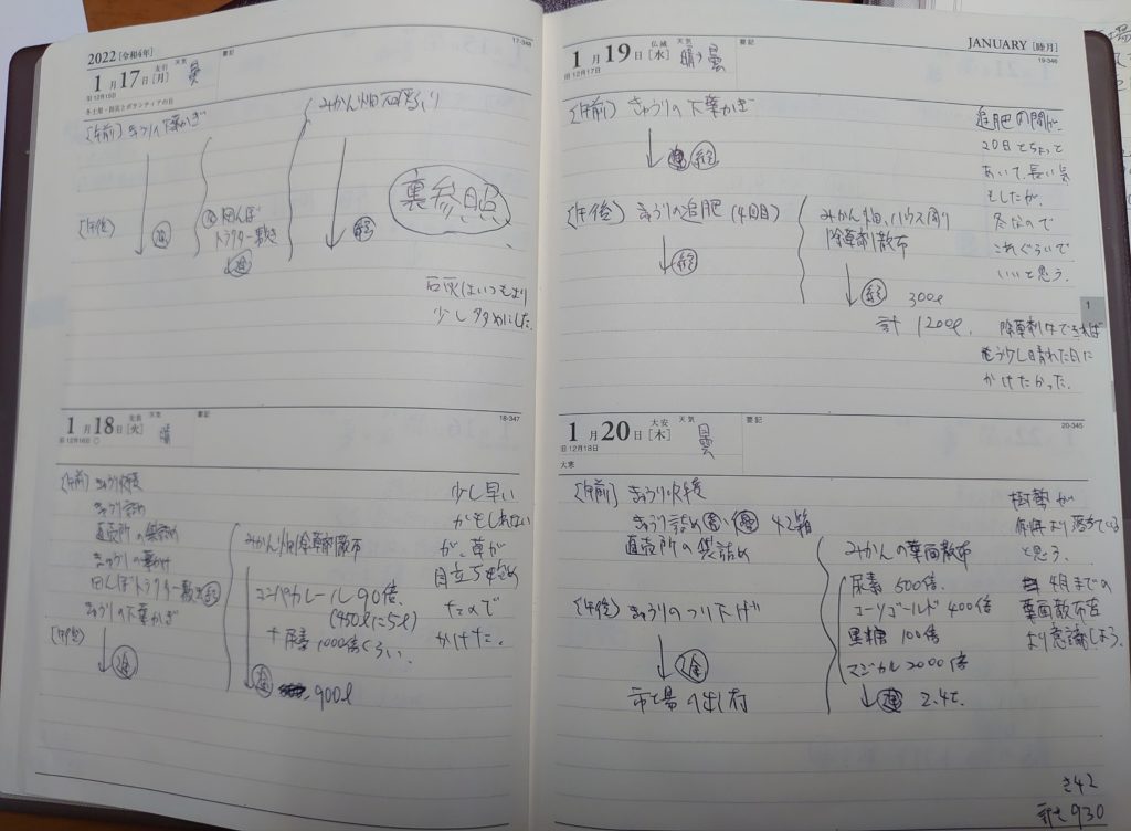 先程上記で説明した書きやすく、見やすい日誌を心がける理由は見比べるためです。それが全てです。いつと見比べるかというと過去の日誌です。同じ時期に何をしていたのか、この先何をしていたのか、それを見かえして頭の中でシミレーションすることで細かい対策が立てられ仕事効率が上がります。それも日誌の数が増えれば増えるほどです。ですので私的にはパソコンはおススメしません。3、4年分を並べて見比べるのが難しいし、字の書き方でその時の感情が分かるからです。見比べやすい日誌を作りましょう。
